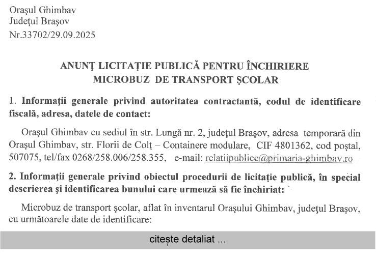 06/08/2025 | 06.08.2025 – Anunț nr. 29677/06.08.2025 cu privire la afișare Proiect de Hotărâre pentru Consultare publică privind aprobarea Regulamentului de atribuire și funcționarea parcărilor de reședință, publice și private din orașul Ghimbav, jud. Brașov | |