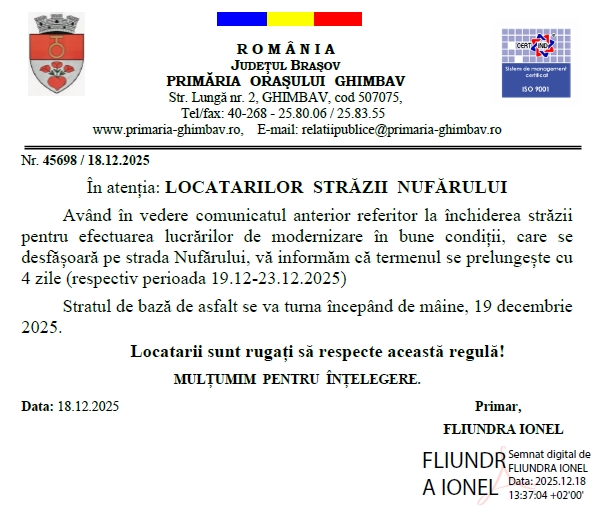 | 28/10/2025 | 28.10.2025 – Anunț nr. 38652/28.10.2025 cu privire la afișare Proiect de Hotărâre pentru Consultare publică privind aprobarea Planului Urbanistic Zonal (P.U.Z.) „str. Gențianei” din orașul Ghimbav, jud. Brașov | |