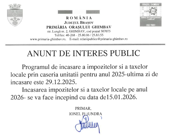 | 05/01/2026 | 05.01.2026 – Anunț nr. 17/05.01.2026 cu privire la afișare Proiect de Hotărâre pentru Consultare publică privind aprobare Plan Urbanistic Zonal (P.U.Z.) „Actualizare PUZ aprobat prin HCL nr. 11/25.02.2009, conform ADR. nr.2279/2280 din 07.02.2024 (eliberată de Primăria orașului Ghimbav) – Lotizare, Zonificare funcțională”, orașul Ghimbav, jud. Brașov identificat prin extrasele CF nr. 103275 și CF nr. 103278, Ghimbav, jud. Brașov | |