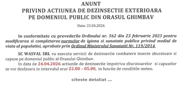 | 19/03/2026 | 19.03.2026 – Anunț nr. 14450/19.03.2026 cu privire la afișare Proiect de Hotărâre pentru Consultare publică privind aprobarea Proiectului de Hotărâre pentru etapa aprobării Planului Urbanistic Zonal (P.U.Z.) „Amenajare Promenadă Strada Morii”, orașul Ghimbav, jud. Brașov | |
